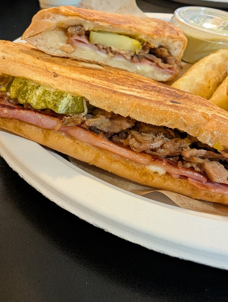 We weren't sure what the protocol was at first. Do we wait to be seated? Are there servers? Then the man at the register handed us menus & said sit anywhere & order at the counter when ready. You can see them preparing the food behind them. Everything looked fresh. We got a junior Cuban with plantains & a Havana burger. The food was brought out to us hot & fresh. Drinks were Self serve. The plantains were caramelized & hot. The burger was saucy & stacked. A great lunch for under $30.